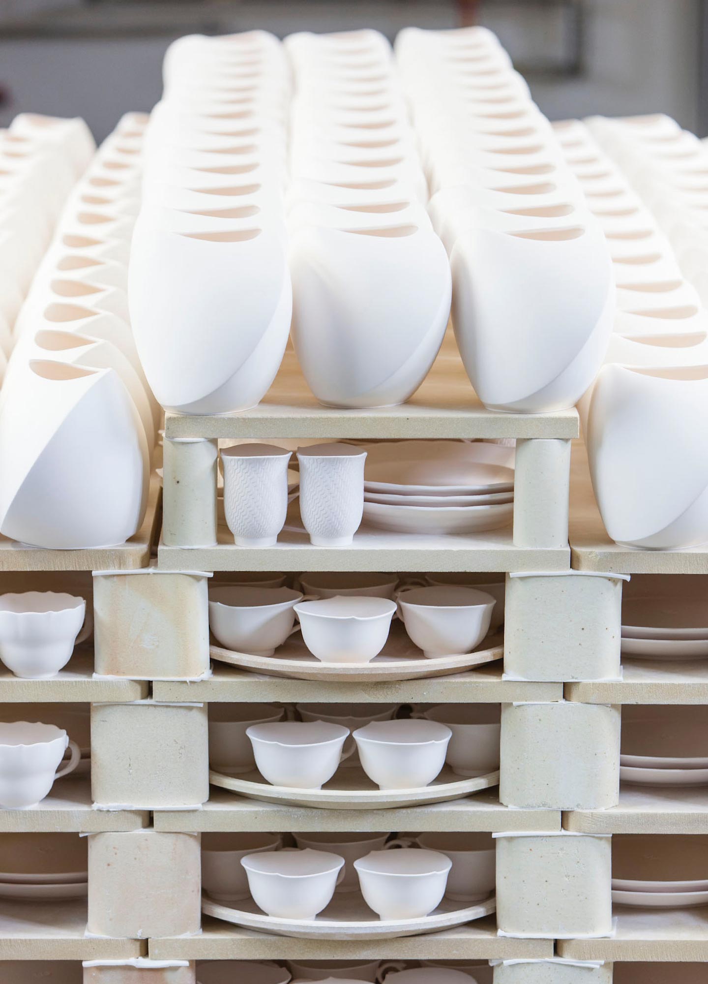 GlattbrandEinmalig gebrannte Porzellane erhalten in der rosa Tauchglasur – oder Figuren durch Besprühen – ihre Veredelung. Denn beim anschließenden Glattbrand von bis zu 1.400° C verschmilzt die Glasur mit dem porösen Porzellan, das beim Brennen über bis zu sechs Tagen um etwa ein Sechstel schrumpft. Nur wenn Massezusammensetzung und Brenntechnik optimal aufeinander abgestimmt sind, lassen sich die besondere Härte und der hohe Weiß-Grad echten Meissener Porzellans erzielen.