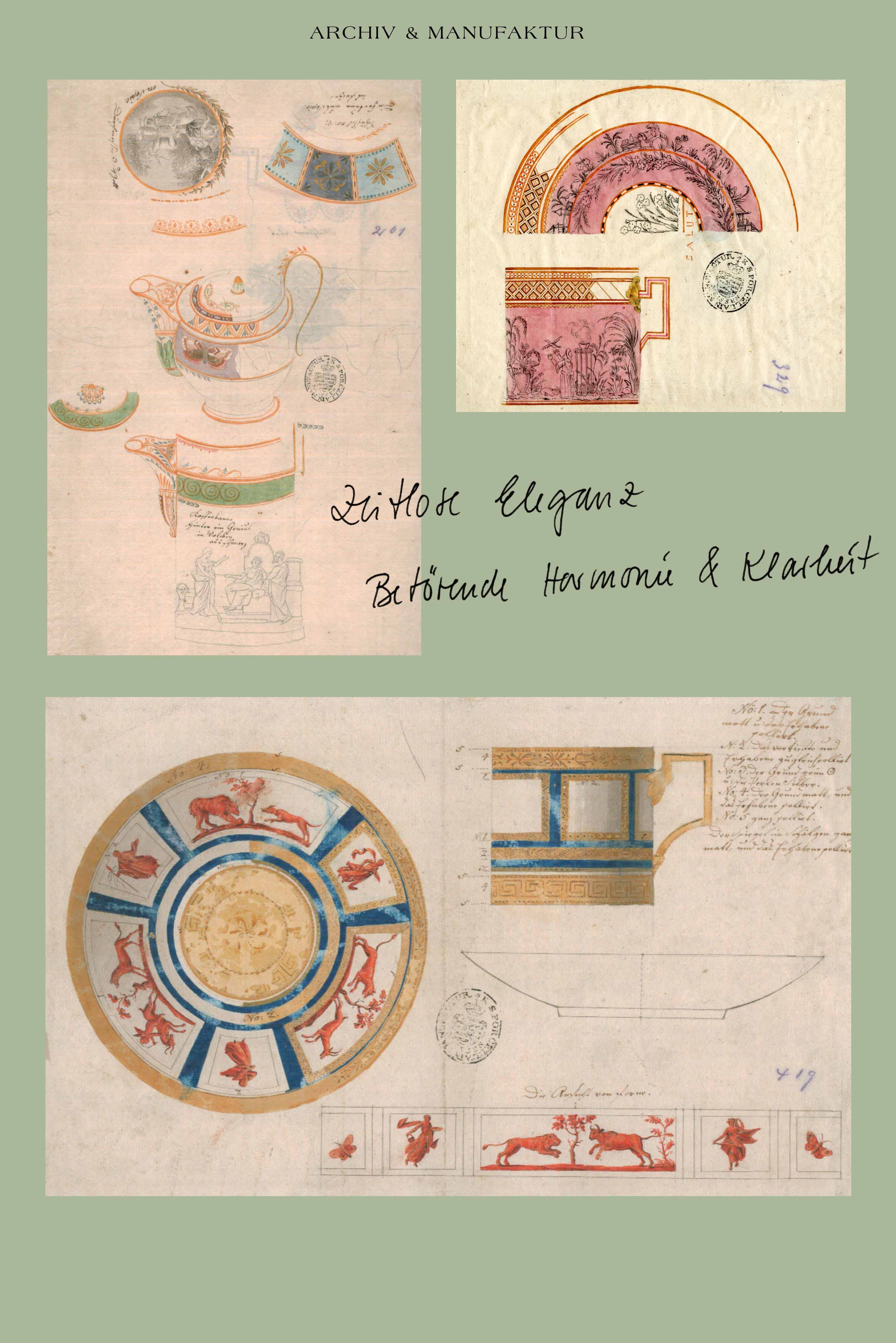geschichte. Die Kollektion widmet sich dabei verschiedenen gestalterischen Sujets in Handmalerei sowie grafische Inszenierungen, die auf der klassizistisch inspirierten Form „Berlin“ umgesetzt wurden.