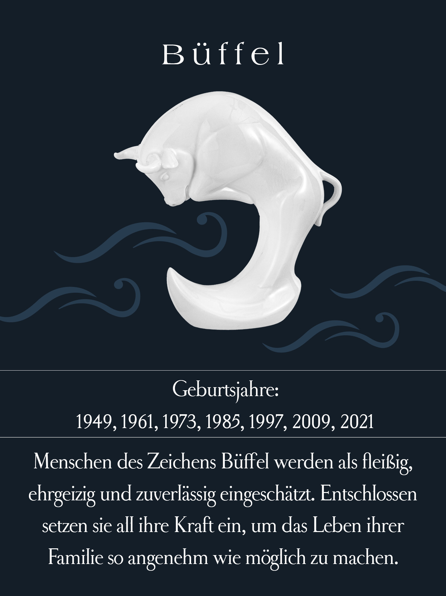 Der althergebrachte Glaube, dass Planeten und Sterne mit ihren festen Zyklen einen Einfluss auf das irdische Leben haben, ist in China nach wie vor weit verbreitet und ein Bestandteil der Kultur. Die sagenumwobenen zwölf chinesischen Tierkreiszeichen spielen dabei eine besondere Rolle im Leben der Menschen. Früher waren sie wichtig, um die einzelnen Jahre zu datieren. Zudem wurden jedem Tier menschliche Eigenschaften zugesprochen. Noch heute wird den Deutungen Glauben geschenkt, denn sie sollen Einfluss auf das Leben haben. Der Überlieferung nach werden den Tierkreiszeichen in den jeweiligen Geburtsjahren folgende Bedeutungen zugesprochen: Ratte (Geburtsjahre: 1924; 1936; 1948; 1960; 1972; 1984; 1996; 2008; 2020; 2032) Die Ratte steht in erster Linie für Weisheit. Wer das chinesische Tierkreiszeichen Ratte in seinem Geburtsjahr trägt ist fröhlich, neugierig, klug und ehrlich. Büffel (Geburtsjahre: 1925; 1937; 1949; 1961; 1973; 1985; 1997; 2009; 2021; 2033) Menschen des Zeichens Büffel werden als fleißig, ehrgeizig und zuverlässig eingeschätzt. Entschlossen setzen sie all ihre Kraft ein, um das Leben ihrer Familie so angenehm wie möglich zu machen. Tiger (Geburtsjahre: 1926; 1938; 1950; 1962; 1974; 1986; 1998; 2010; 2022; 2034) Der Tiger ist stark und von seiner Wesensart sehr mutig. Menschen, die in diesem Tierkreiszeichen geboren sind, sind Idealisten, die genauso leidenschaftlich wie auch fürsorglich sein können. Hase (Geburtsjahre: 1927; 1939; 1951; 1963; 1975; 1987; 1999; 2011; 2023; 2035) Wer im Jahr des Hasen geboren ist, dem wird nachgesagt, vorsichtig, geduldig und freundlich zu sein. Durch dieses sanfte Wesen fungieren die Menschen oft als Streitschlichter. Drache (Geburtsjahre: 1928; 1940; 1952; 1964; 1976; 1988; 2000; 2012; 2024; 2036) Der Drache ist das einzige Fabelwesen innerhalb der chinesischen Tierkreiszeichen. Er ist kraftvoll, stark und ehrgeizig. Zudem ist er bereit seine eigenen Ziele zurückzustellen, denn es ist ihm wichtiger anderen Menschen zu helfen.