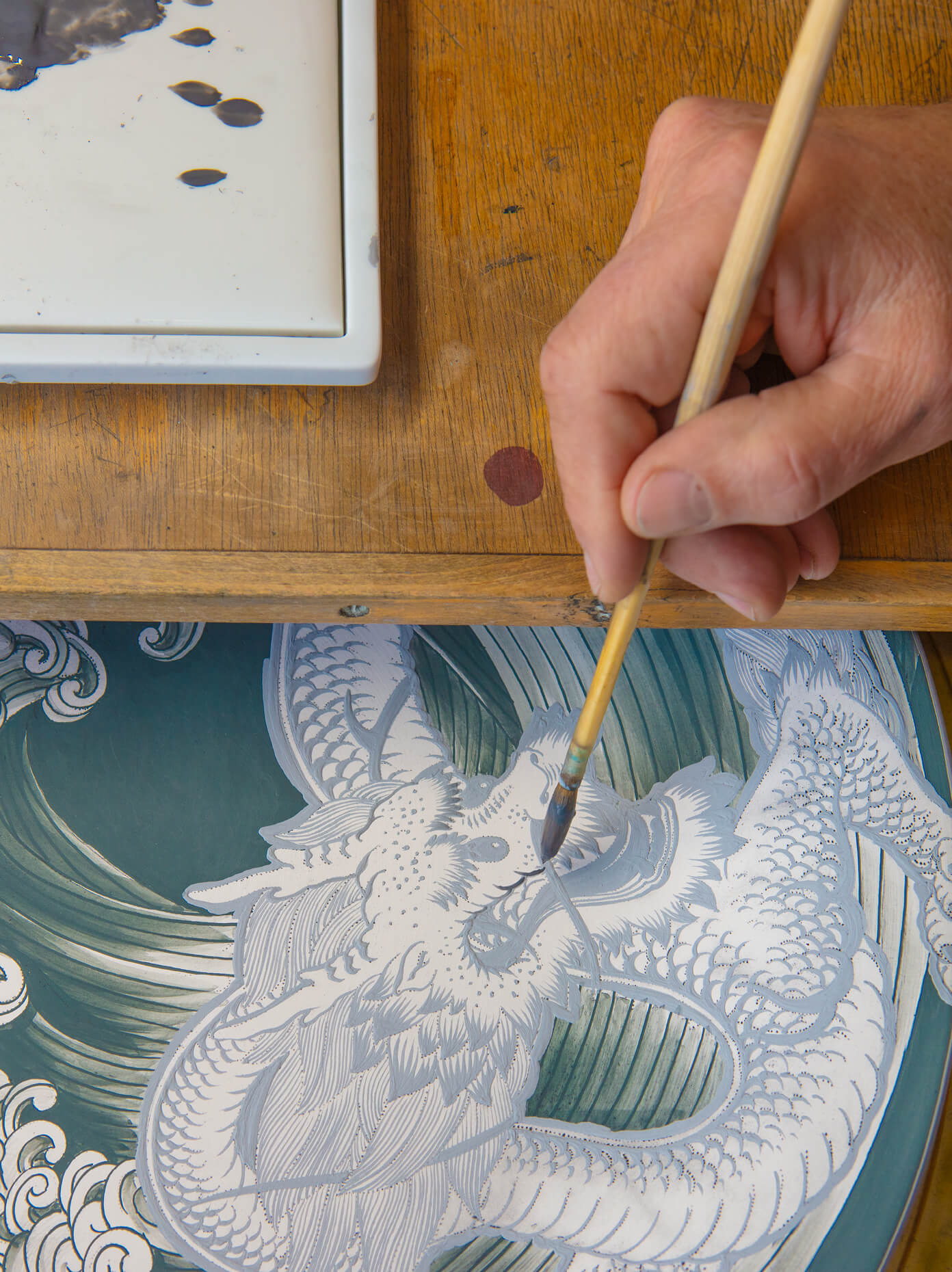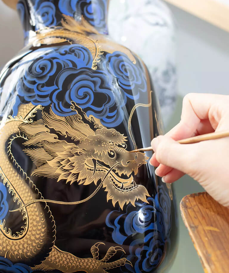 Im Gegensatz zum Reichen Drachen hatte man bei der Entwicklung des Ming-Drachen-Dekors keine konkreten Vorlagen zur Hand, an denen man sich exakt orientieren konnte. Stattdessen musste man auf Überlieferungen zurückgreifen, ohne die tiefen Symboliken hinter den kleinen Details zu kennen. Um dies zu beheben und die Kultur hinter dem Drachen zu ehren, widmete sich unsere Produktdesignerin Zhuoyu Hou, deren Wurzeln bis hin zu einem kleinen Dorf im Süden Chinas zurückführen, der Gestaltung eines echten (kaiserlichen) Drachens. So entstand im Jahr 2022 der neue „Glücksdrache“, der sich erheblich von seinem Vorgänger unterscheidet – beispielsweise durch eine Zunge, die nicht herausgestreckt wird, ein Schwanzende mit Haaren und vor allem Gliedmaßen mit fünf Krallen.