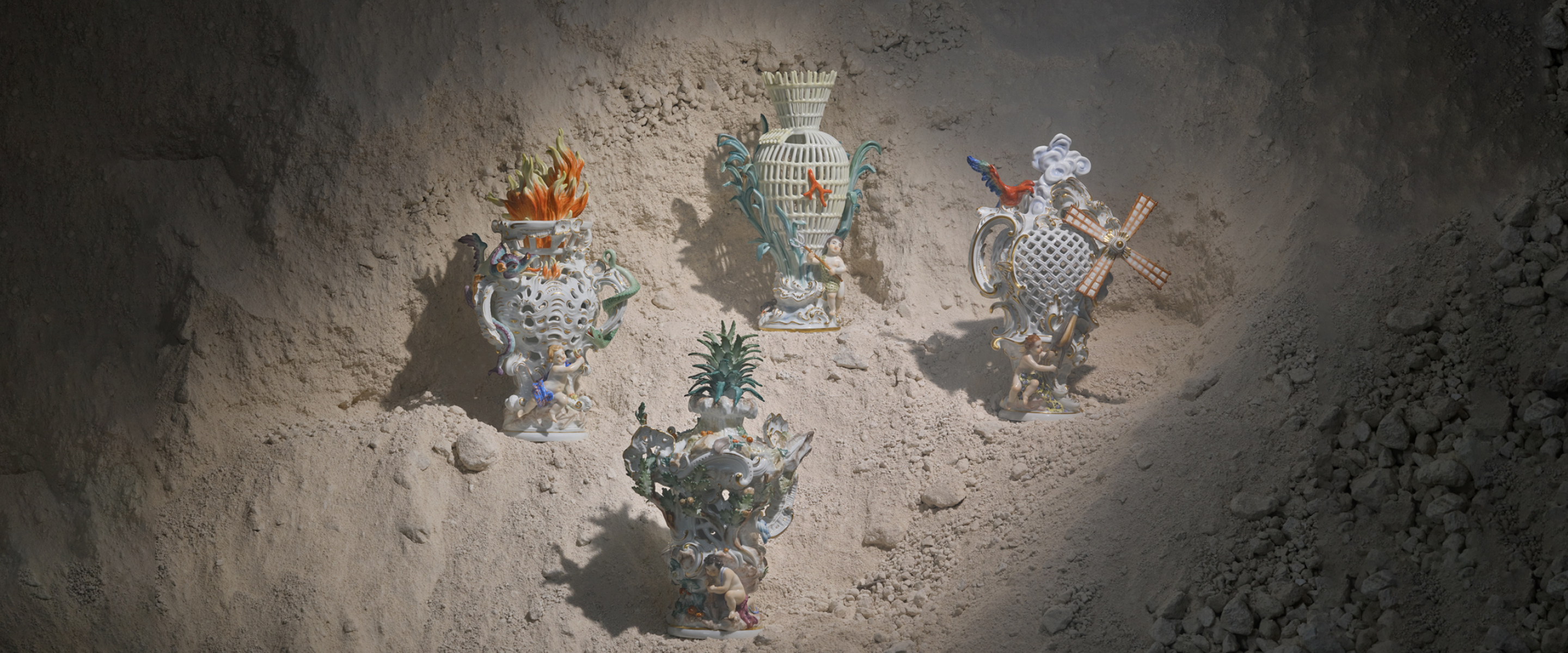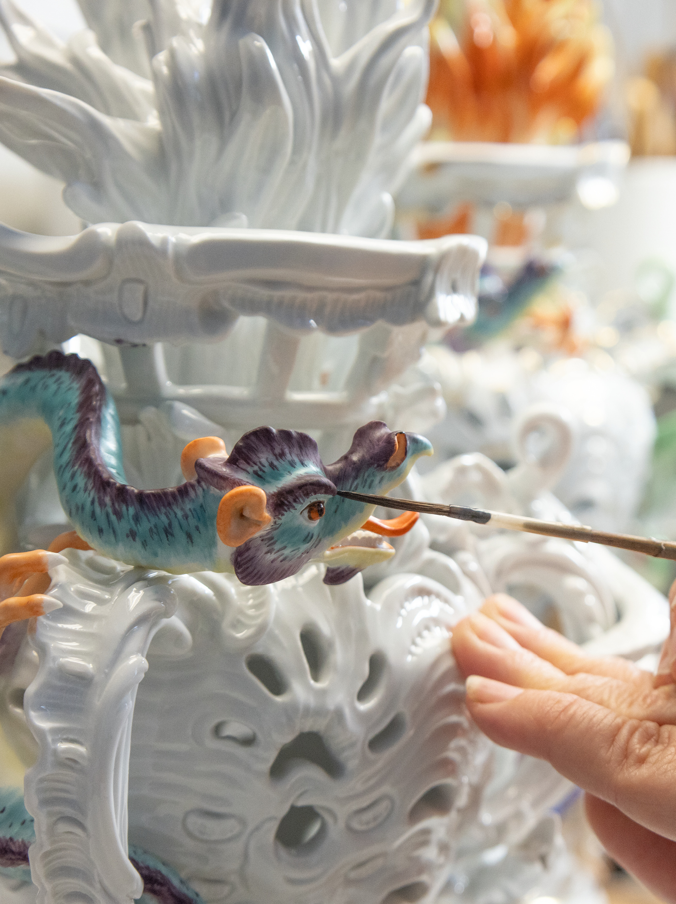 Bei der Neuauflage der „kleinen“ Elementevasen, wurden die MEISSEN Manufakturisten allerdings gleich mit mehreren kunsthandwerklichen Herausforderungen konfrontiert. So galt es bei der Vase „Luft“ 60 einzelne Formen zusammenzusetzen, das Windmühlenrads anzupassen und den Blasebalg passgenau anzufügen. Die Vase „Wasser“ besteht aus 54 einzelnen Formen und insbesondere das Einpassen und Ansetzen der filigranen, netzartigen Reuse erfordert viel Fingerspitzengefühl. Die aus 32 einzelnen Formen bestehenden Vase „Erde“ sticht durch die Agave am Flaschenhals heraus, welche zahlreiche einzelne Blätter trägt, die modelliert, zusammengefügt und schließlich staffiert werden müssen. Die Vase „Feuer“ zählt sogar ganze 85 einzelne Formen. Gemeinsam haben alle vier Vasen die handwerkliche Schwierigkeit in der Herangehensweise des Durchbruchs – wann ist der richtige Zeitpunkt, um ihn auszuschneiden, wann müssen Drachen oder andere Dekorationen angebracht werden? Doch all die Mühen haben sich gelohnt und so konnte ein Werk europäischer Porzellankunst mit langer Geschichte wiederentstehen.