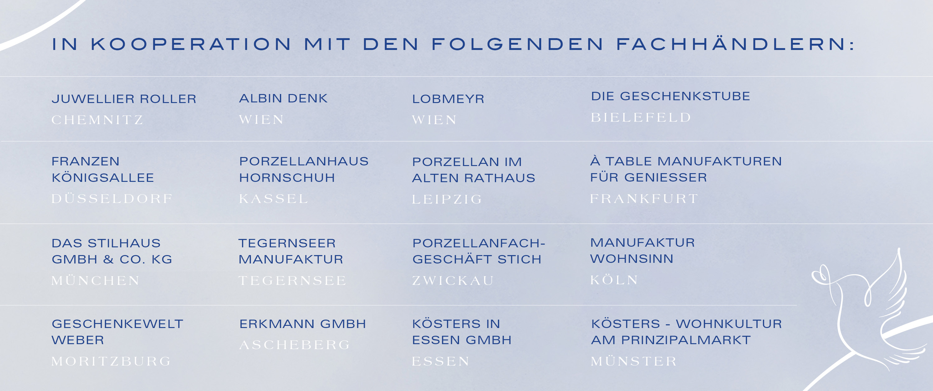 Wir sind tief getroffen und erschüttert von dem Leid und der Verzweiflung, welches die Menschen durch den Krieg in der Ukraine gerade erfahren. Wir möchten uns solidarisch mit den Menschen in der Ukraine zeigen und haben uns entschieden, auch aktiv zu unterstützen. Unsere hochtalentierten Auszubildenden haben in kürzester Zeit verschiedene Friedenssymbole, die als Porzellandekore geeignet sind, entwickelt. Aus den vielen Vorschlägen haben wir uns für drei Friedenssymbole entschieden. Diese zeigen wir in Blau und Gold auf unseren beliebten Mugs. Sie setzen das Zeichen, dass wir für Frieden einstehen und den Menschen in der Ukraine, die verzweifelt sind, Angst haben und sich hilflos fühlen, zur Seite stehen. So werden wir 20% des Erlöses aus dem Verkauf dieser Mugs der Hilfsaktion „Nothilfe Ukraine“ des „Deutschen Roten Kreuzes“ spenden. Auch unser handgemaltes Wandbild „Friedenstaube“ steht symbolisch für Frieden und wird Teil der Spendenaktion werden. Hier gehen auch 20% des Erlöses aller verkauften Wandbilder an die „Nothilfe Ukraine“ des „Deutschen Roten Kreuzes“.