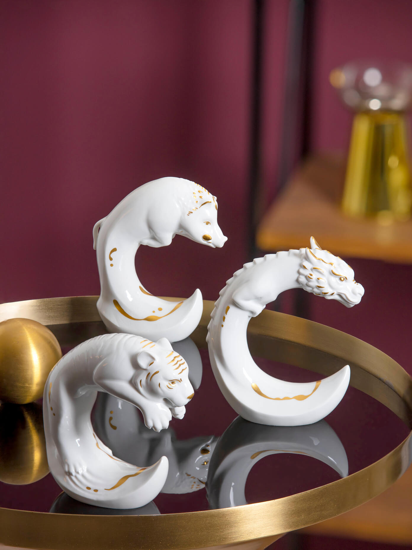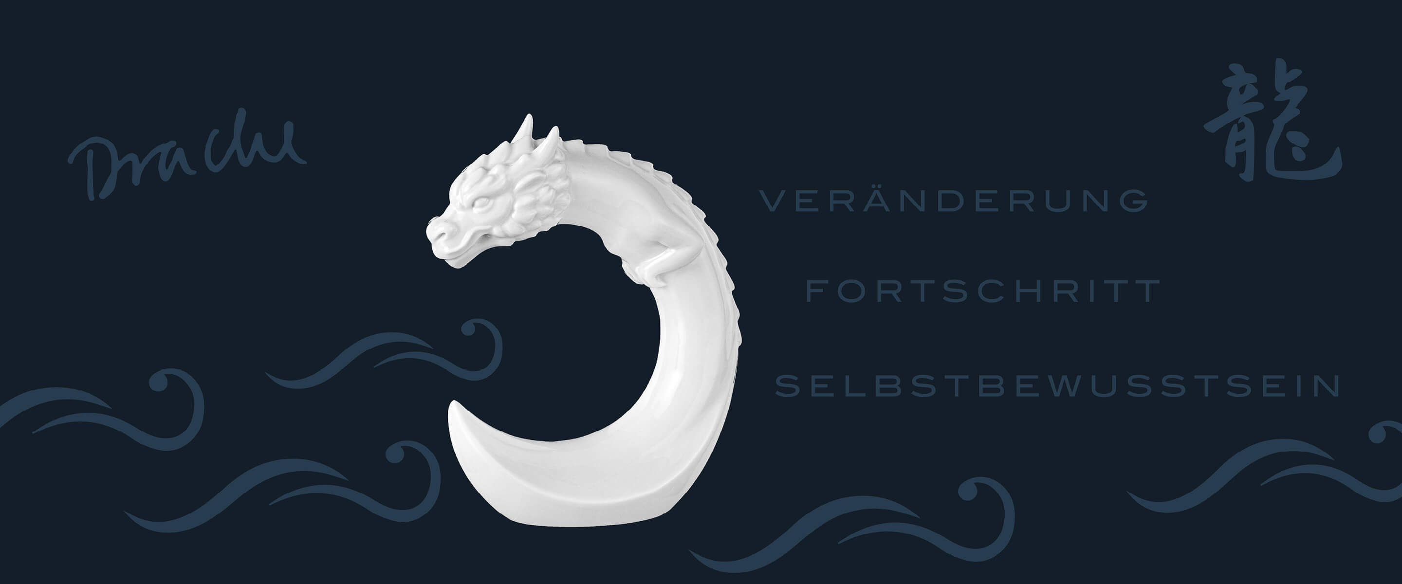 Die künstlerische Interpretation der chinesischen Tierkreiszeichen in der gleichnamigen Kollektion von Maria Walther verleiht den majestätischen Tieren eine lebendige Präsenz. Jede Figur beschreibt die Legende des großen Rennens, welches vom Jade-Kaiser im gesamten Tierreich ausgerufen wurde. Die zwölf Tiere, welche das Ziel als erstes erreichten, sollten im chinesischen Horoskop verewigt werden. Der mächtige Drache wurde als Erstes am anderen Ufer erwartet, jedoch kam er auf seinem Weg an einem Dorf vorbei, welches unter einer erheblichen Dürre litt. So verweilte der Drache im Dorf, um es regnen zu lassen, bevor er seinen Weg fortsetzte – Schlussendlich kam er als Fünfter ins Ziel. Die kraftvolle Bewegung des Drachen wird durch die dynamischen Linien und die lebendige Ausdrucksweise des Porzellans eingefangen. Der Drache, ob in purem Weiß oder golden staffiert, erscheint fast lebendig, bereit, in die Welt zu treten und sein Vermächtnis zu hinterlassen.
