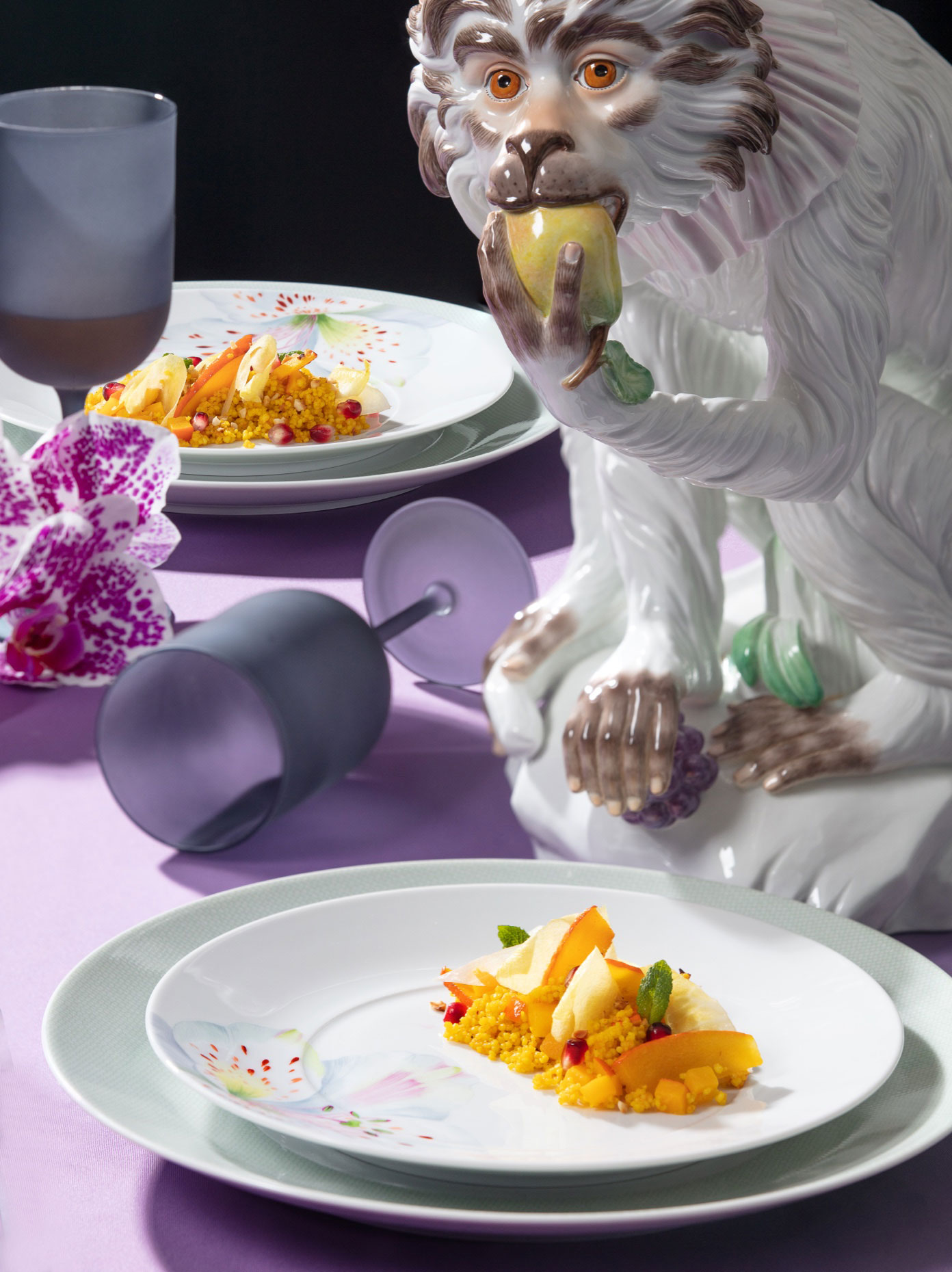 Wie wäre es mit einer feinen Waldpilzcremesuppe im Schwanenservice-Gourmetteller, arrangiert auf einem rustikalen Holztisch? Oder mit einem exotischen Avocado-Mango-Salat in Kombination mit dem SWORDS-Service auf edler Leinentischdecke? Oder mit Gebackener Ente an Orangensauce mit Rotkohl und Klößen, serviert auf NOBLE BLUE im Mix & Match mit ROYAL BLOSSOM?