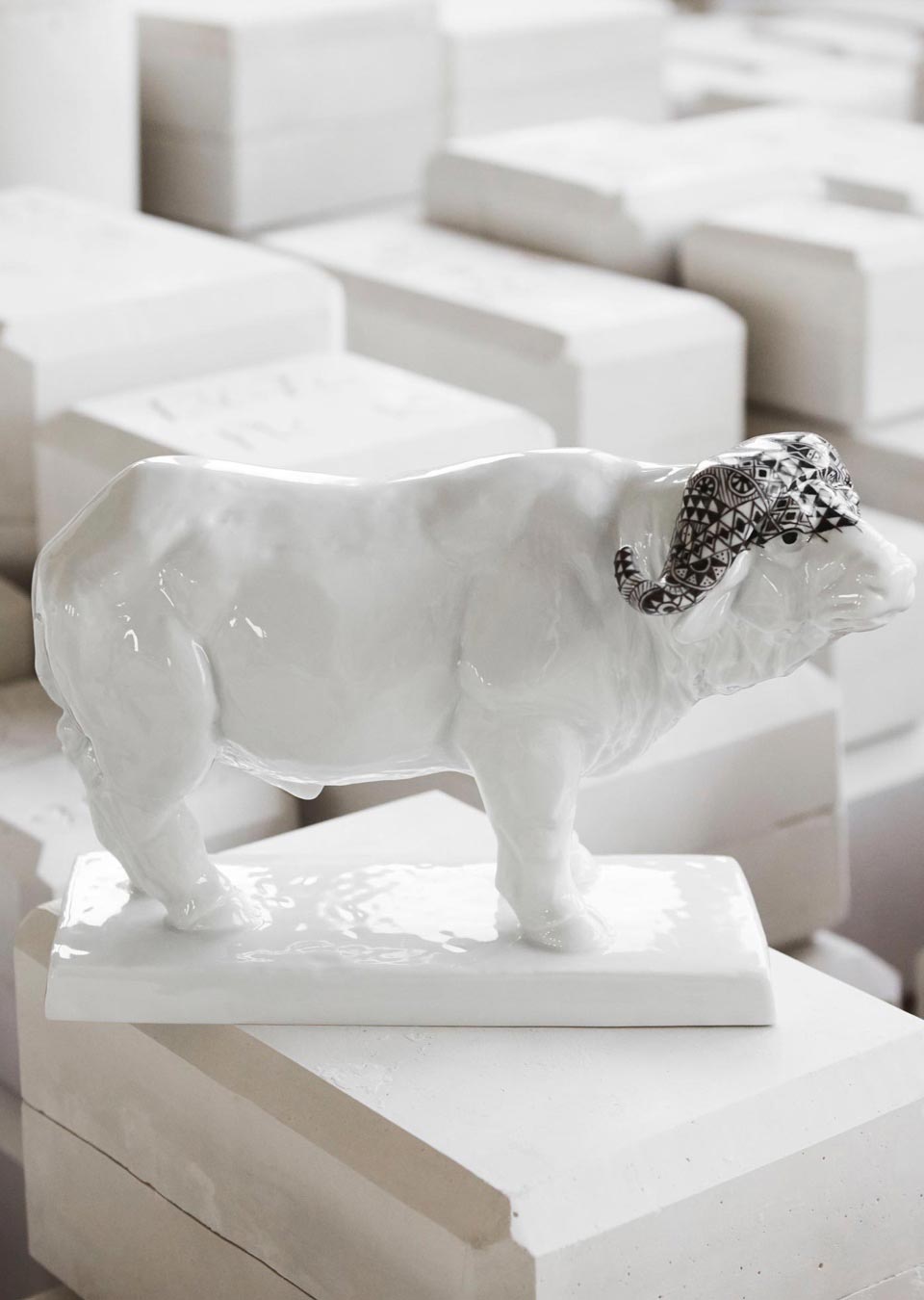 In der ersten Produktionsphase, der Ausformung des Scherbens, wird der Körper der Vase sowie anzugliedernde Teile mittels Gipsformen ausgeformt. Diesen Arbeitsschritt unterstützend wird ein eigens entwickeltes Färbemittel eingesetzt, um innere Konturen zu kreieren und die korrekte Dicke der Vasenwände zu garantieren. Über einen Trocknungszeitraum von mehreren Wochen entziehen die Gipsformen dabei der flüssigen Porzellanmasse das Wasser und hinterlassen feste Rohlinge, die schließlich behutsam zusammengesetzt werden.