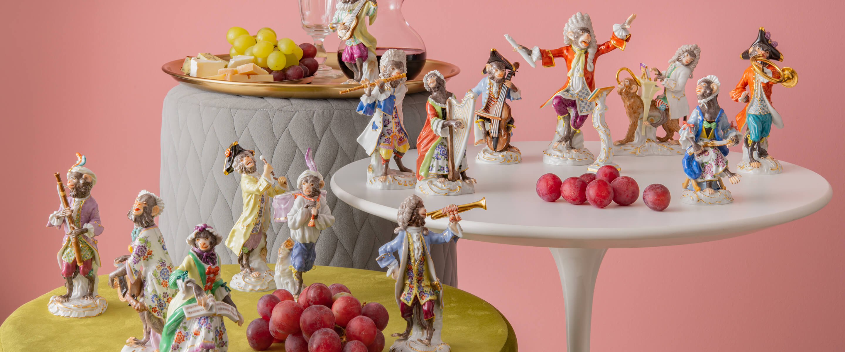 Eine beliebte Sammelserie von MEISSEN ist beispielsweise die „Affenkapelle“. Fans lieben diese Serie aus verschiedenen Gründen. So wurde diese in Ihrer ersten Ausführungen von dem bedeutenden Modelleur Johann Joachim Kaendler höchstpersönlich kreiert. Zudem greift die Serie zu Ihrer Entstehungszeit den aktuellen Trend der Zeit rund um das Sujet der Singerie auf – also Affen, die in menschlicher Kleidung ihre Vorbilder auf humoristische Art und Weise nachahmten und parodierten. Bis heute hat die Eleganz der Figuren nichts von ihrer Anziehungskraft verloren.