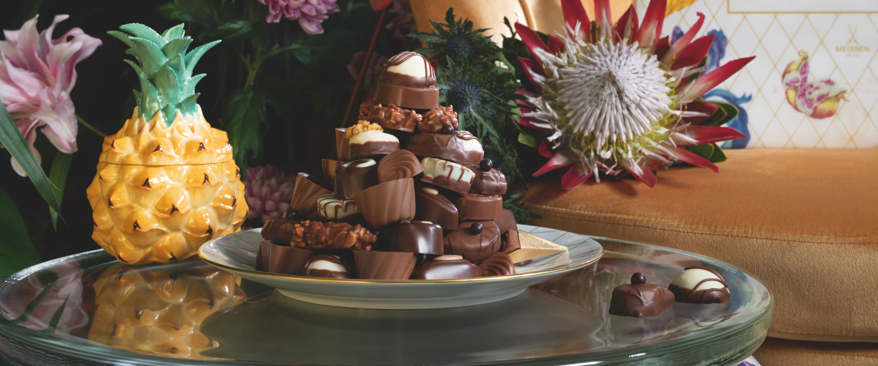 Auch wir von der Porzellanmanufaktur MEISSEN zelebrieren die köstliche Sinnesfreude zu jedem Anlass. So strahlt die Zusammenarbeit mit dem Schweizer Schokoladenhersteller Lindt in vollem Glanz, anlässlich der puren Lebensfreude und des uneingeschränkten Genusses. Die exklusive Lindt x MEISSEN Sonderedition der HOCHFEIN Pralinés und die dazu passende einzigartige Porzellan-Serie präsentieren ein faszinierendes, exotisches Dekor, das aus goldenen Kakaofrüchten, üppigen Federmohnblüten, zarten Irisblumen und saftigen Feigen besteht. Hier vereinen sich das "braune Gold der Azteken" und das "weiße Gold der Sachsen" zu einer harmonischen Einheit und beflügeln unsere wildesten Schokoladenträume.