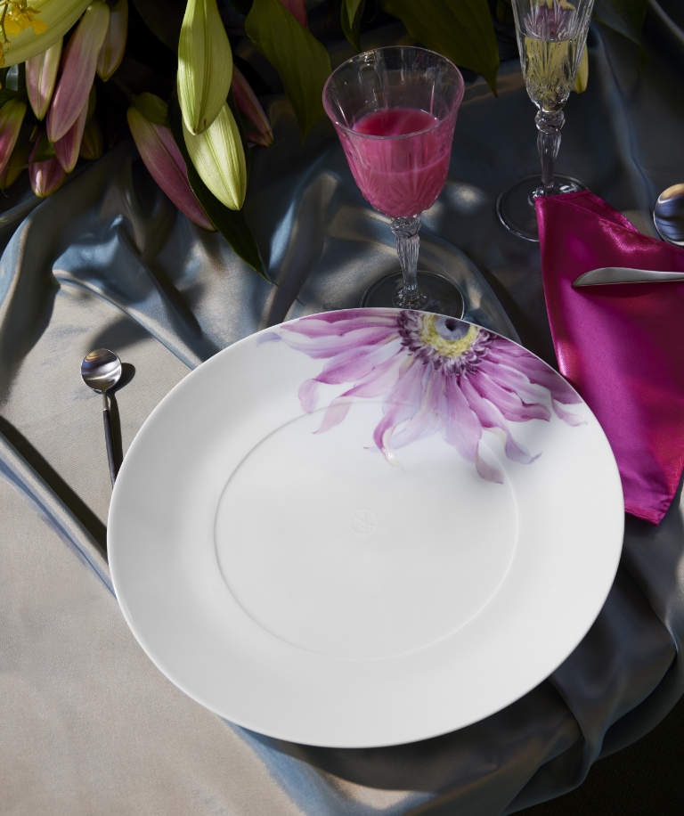 Die neue Trendfarbe passt ideal zu Weiß oder Creme und schafft in der richtigen Komposition ein geradezu magisches Ambiente auf dem heimischen Tisch. Kombinieren Sie bewusst eine blauviolette Tischdecke mit unserem „Giant Bloom“ Service, violetten Servietten und goldenem Besteck. Sie werden merken, wie die kräftigen violetten Akzente in Verbindung mit der zarten Farbgebung der großflächigen Blumenmalerei scheinbar eine Tür zu einer anderen Welt voller Fantasie und Magie zu öffnen vermögen.