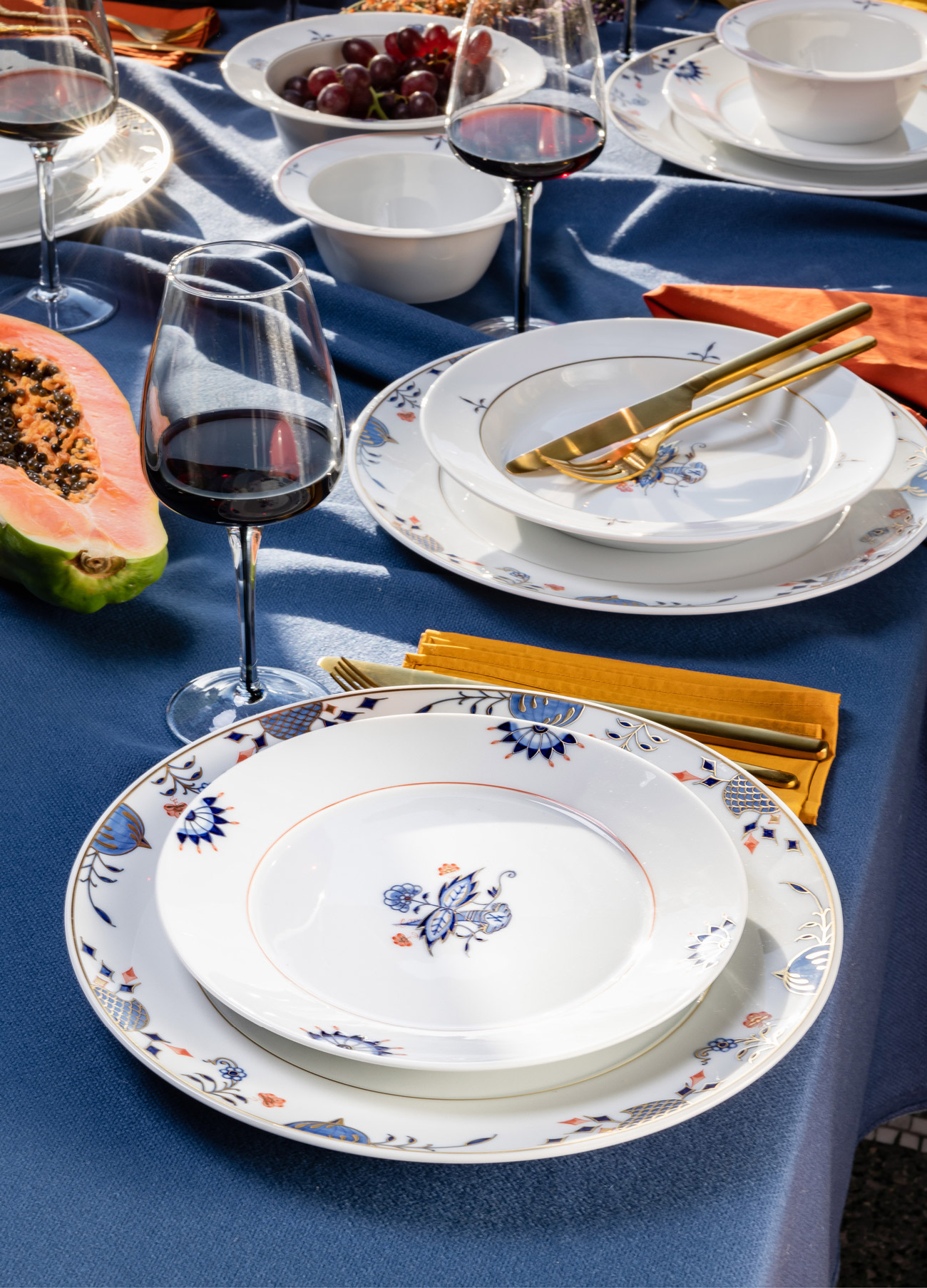 auf der Form N°41Bereits 1731 entsteht das Meissener „Zwiebelmuster“, der erfolgreichste Blaudekor der Porzellangeschichte. Tatsächlich stellt die Malerei auf dem Tellerrand Pfirsich und Melone dar sowie Bambusstock und die zarten Blüten der Chrysantheme in der Mitte. Erstmals in der Geschichte Meissens wird das historische Zwiebelmuster nun auch auf einer weiteren Serviceform umgesetzt. So erhält das berühmte Dekor auf der modernen Form „N°41“ eine völlig neue Bühne und lädt gleichzeitig zum „Mix&Match“ mit anderen Porzellanen ein. Die Opulenz des historischen „Zwiebelmuster“ tritt in Kontrast zu den klaren Linien und der modernen Ästhetik der Form „N°41“ und entfaltet so eine gänzlich neue Strahlkraft.