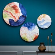 Wer Wandteller als Teil einer durchdachten Einrichtung versteht, führt diese Bildsprache weiter. Handgemalte Porzellan Gemälde übersetzen die gleiche Sorgfalt in eine andere Bildform, während ausdrucksstarke Wandbilder den Dialog über Format und Bildspannung öffnen. So entsteht ein ruhiges Zusammenspiel, in dem Porzellan nicht dekorativ wirkt, sondern wie eine konzentrierte Art von Wandkunst, präzise geführt und von einem Material getragen, das Tiefe anders trägt als jede Leinwand.