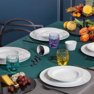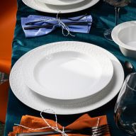 Ein Pastateller entfaltet seine Wirkung besonders dann, wenn er in eine Abfolge eingebettet ist, die den Tisch wie aus einem Guss erscheinen lässt. Für Vorspeisen schaffen Speiseteller eine ruhige Fläche, auf der sich kleine Kompositionen klar abzeichnen. Für Cremes, Brühen oder Ragouts bilden Suppenteller den passenden Gegenpol, bevor die Pastateller mit tiefer Form den Übergang zu saucenreichen Hauptgerichten übernehmen. Danach lässt sich der Rhythmus mit Desserttellern wieder verfeinern, und ein Brotteller ergänzt dort, wo kleine Gesten den Unterschied machen. Wer dem Gesamtbild eine repräsentative Basis geben möchte, setzt mit einem Platzteller einen ruhigen Unterton, der die übrigen Formen optisch trägt. So entsteht ein Ensemble, das nicht nach Regeln wirkt, sondern nach Selbstverständlichkeit.
