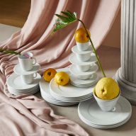 Auch die Übergänge bleiben leicht. Für Gerichte, die zwischen Tiefe und Fläche spielen, führt ein weiter Pastateller den Blick wieder nach außen. Den Abschluss begleitet ein zarter Dessertteller, der bewusst kleiner wirkt und dem letzten Gang eine präzise Geste gibt. So entsteht keine Aufzählung, sondern eine Dramaturgie, in der jede Form ihren Platz hat und der Tisch ruhig bleibt.