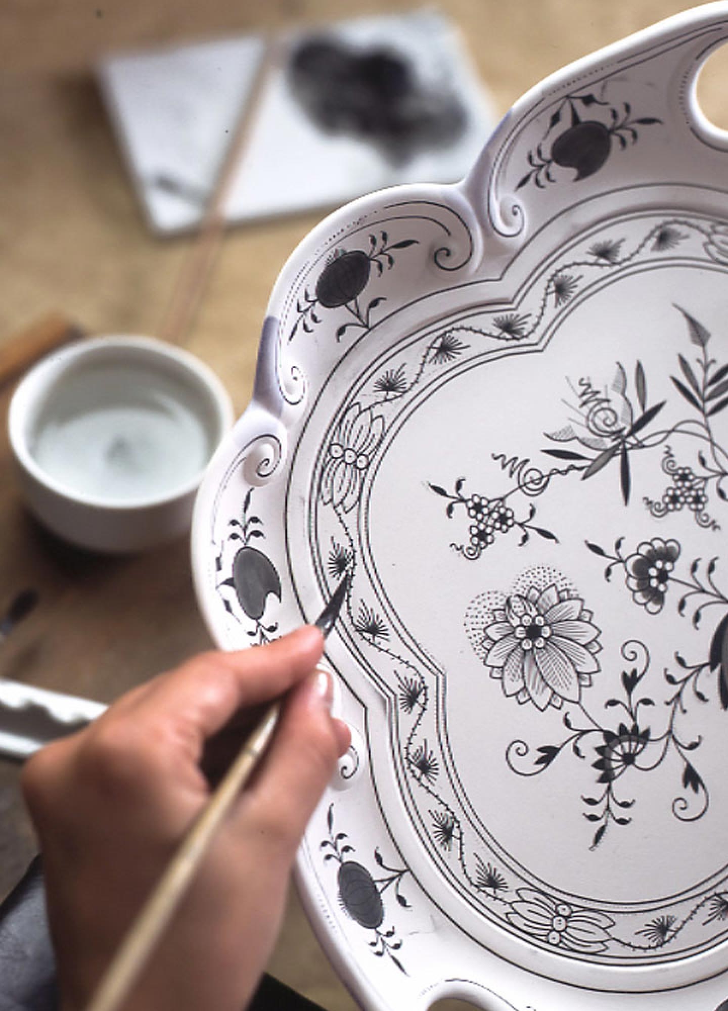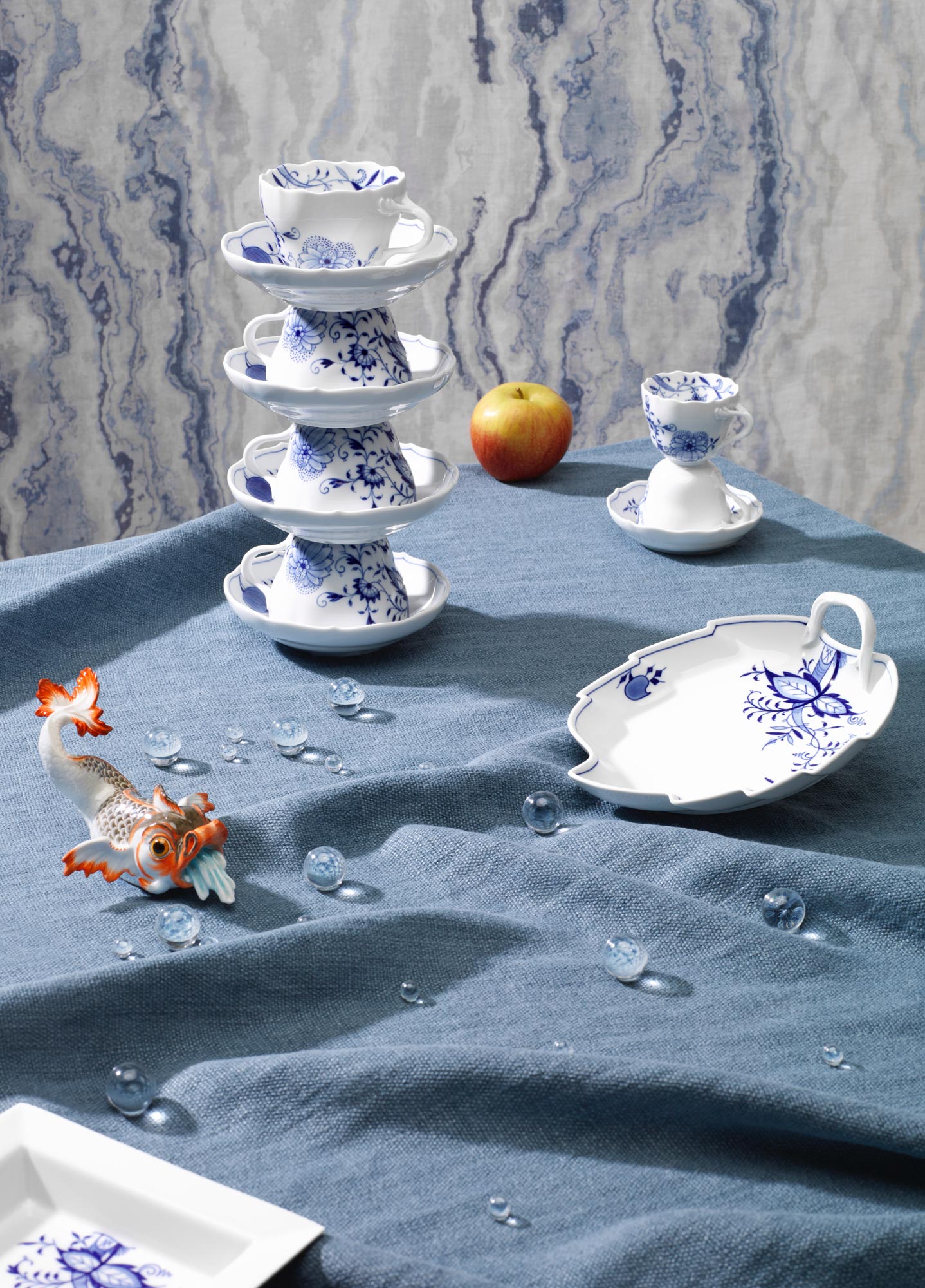 Zwiebelmuster StyleIm Jahr 2004 erfährt das historische "Zwiebelmuster" eine zeitgemäße Überarbeitung. Anstatt der gleichmäßig vollflächigen Bemalung wird die Chrysanthemenblüte asymmetrisch auf dem Tellerspiegel angeordnet. Der Bambusstamm mit Ranken, zarten Blüten und Blättern sowie das Doppelblatt vom klassischen Dekor sind geblieben. Hingegen sind die Früchte vom Tellerrand verschwunden. Der Dekor erscheint aufgelockert und das strahlende Weiß des Porzellans wird stärker betont. Auch auf der Tasse finden sich die Chrysantheme und der Bambusstamm als eine reduzierte, weniger kompakte Bemalung wieder – Umgeben von zarten Ranken scheint der Bambus nahezu aus dieser herauszuwachsen. Die Früchte sind auch hier verschwunden. Nur eine Zwiebel auf der Untertasse erinnert noch an ihre Vorgänger.