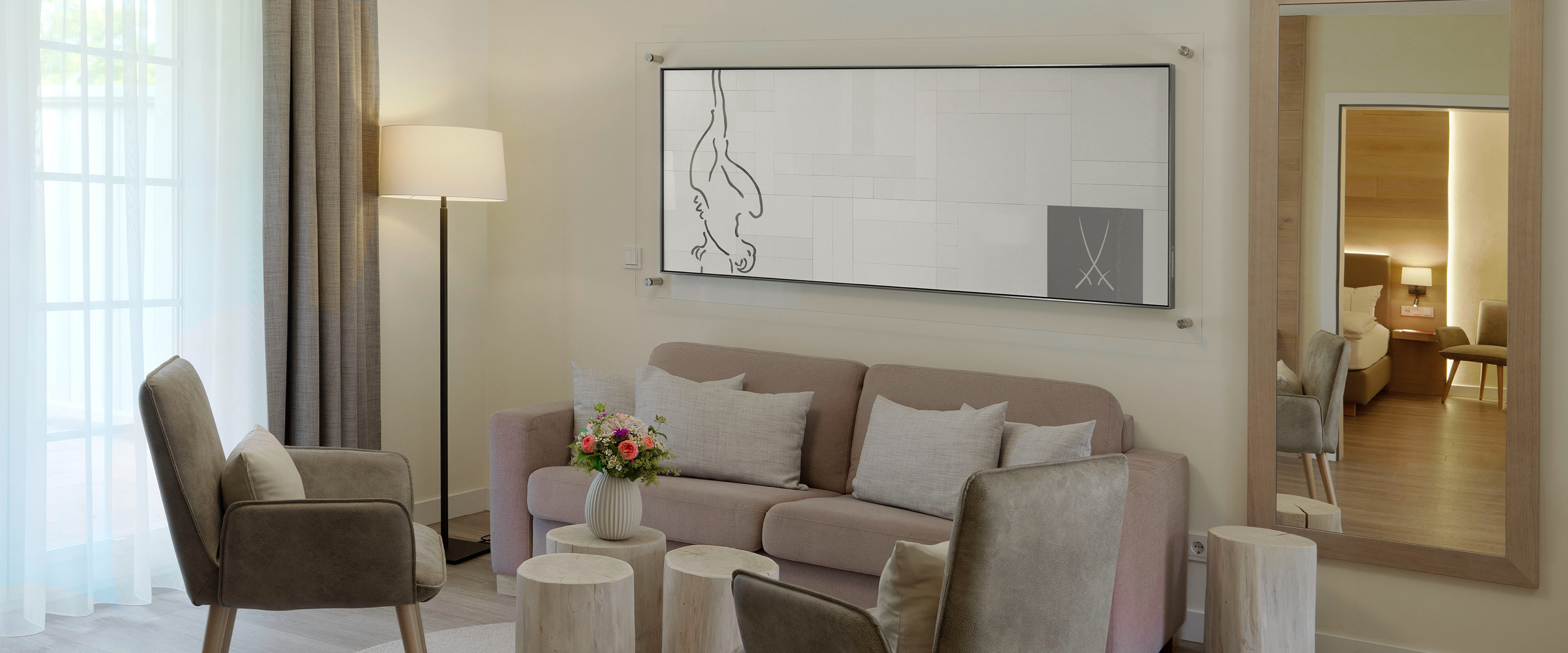 We at MEISSEN share this enthusiasm for the beautiful, the valuable and the extraordinary, which Ritter von Kempski lives out with the operation of the wellness hotel. For this reason, we have worked together to create an extensive art and interior collection for the Nature Resort & Spa Schindelbruch, which invites you to experience this enthusiasm for yourself. To this end, impressive porcelain figurines from the early 18th century have been placed throughout the resort. As a further highlight, ultra-modern wall installations made of white gold can be found in the exclusive suites, which take up the essence of the masterpieces and depict them in an abstracted form with just a few strokes. An exclusive table and dinner service for the gourmet restaurant, developed on the basis of the "MEISSEN® COSMOPOLITAN" and VITRUV collections, and last but not least the first MEISSEN hotel store round off the complete package.