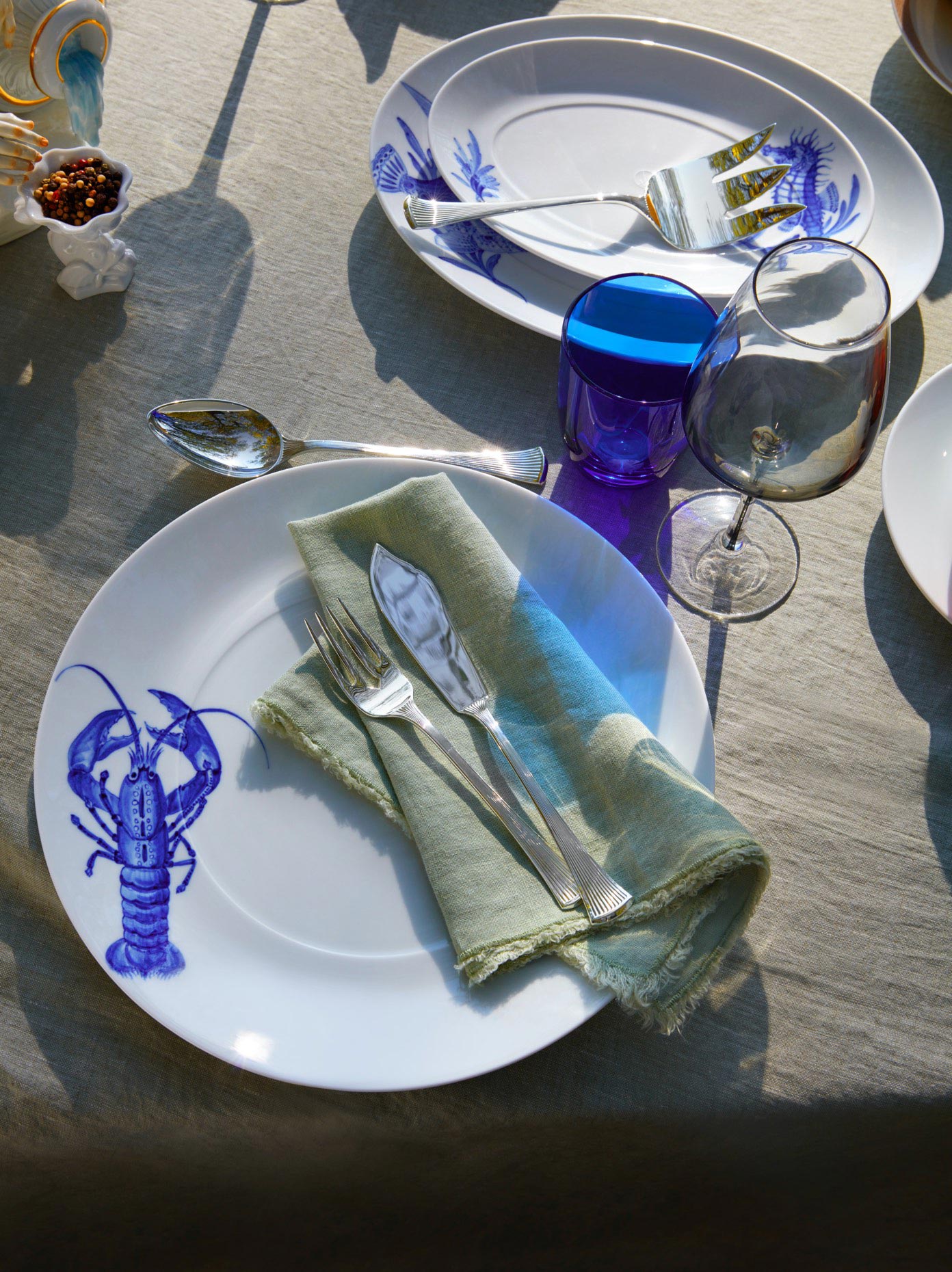• Summer is the season for light fish dishes and seafood menus. As with all table settings, there are special rules to consider when setting the table for fish, crab or seafood, with porcelain tableware requiring dedicated foresight and consideration. The order of the menu determines the scope and scale of the place settings and cutlery: starter or soup plates are placed atop the plate for the main course, which in turn rests on a charger plate. The cutlery should follow the order of the menu from the outside to the inside – the soup spoon on the outside right, fish cutlery for the main course on the very inside. For a multi-course menu that includes a fish course, the appropriate cutlery should be integrated into the ensemble in the appropriate position.