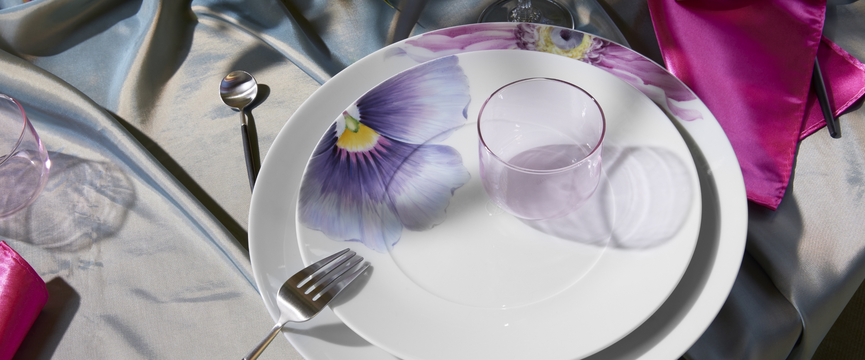 The new trend colour goes ideally with white or cream and, in the right composition, creates an almost magical ambience on the table at home. Deliberately combine a blue-violet tablecloth with our "Giant Bloom" service, violet napkins and golden cutlery. You will notice how the strong violet accents in combination with the delicate colouring of the large-scale flower painting seem to be able to open a door to another world full of fantasy and magic.