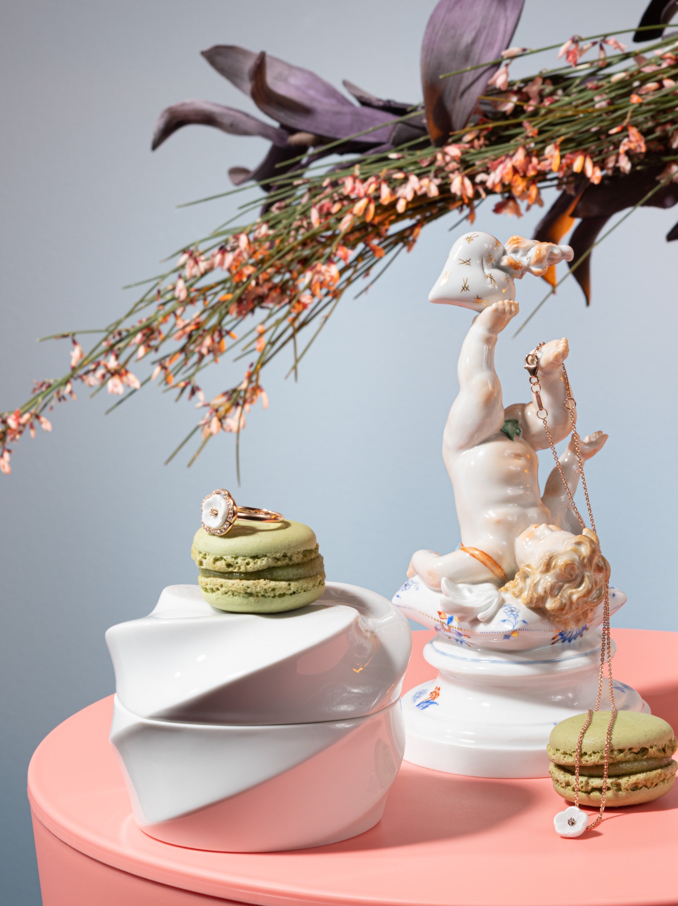 Inspired by a vortex, as in snail shells, twisted shells or rose petals that slowly open, Zhuoyu Hou developed the new "Twist" series of boxes, adding a new design language to the manufactory's repertoire. She chose the geometric cylinder shape as the basic form and brought it to life with symmetrically divided curved surfaces. The curved lines that divide the surfaces glide gently downwards from the centre like a vortex. What is special about this is that when the viewer looks at the organically shaped box from above, they will recognise the Snowball Blossom so typical of MEISSEN.