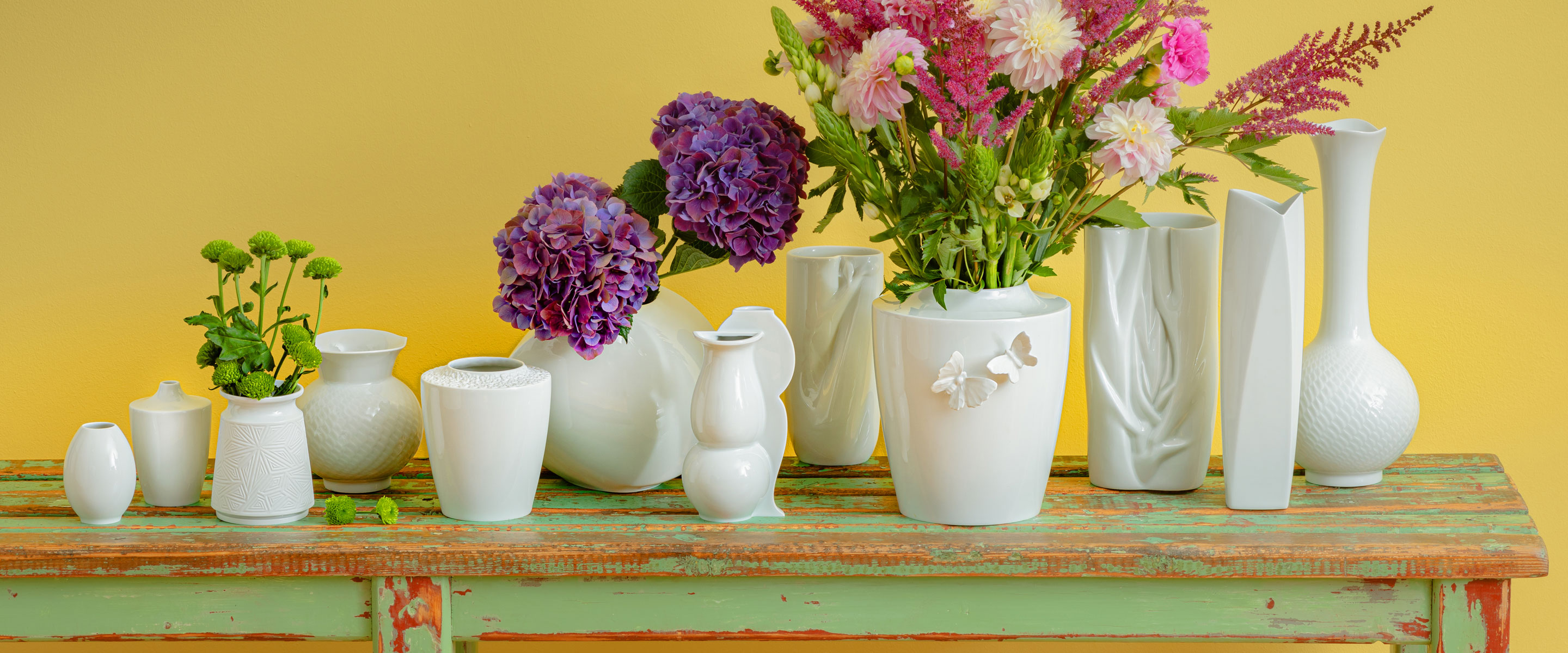 In some cases, it is advisable to combine flowers and vases in an appealing variety to create an impressive overall composition - and sometimes less is simply more. Limited edition masterpieces, such as the “Vase Exotic 1“ are true showpieces of porcelain art and radiate such an impressive presence that they impress on their own. The vase of the „Antarctica“-collection, in turn, is perfect, for complex arrangement with numerous vases and diverse flowers. No wonder, because its unique shape was inspired by penguins - and these, after all, appear in colonies and are a symbol of community and cohesion.
