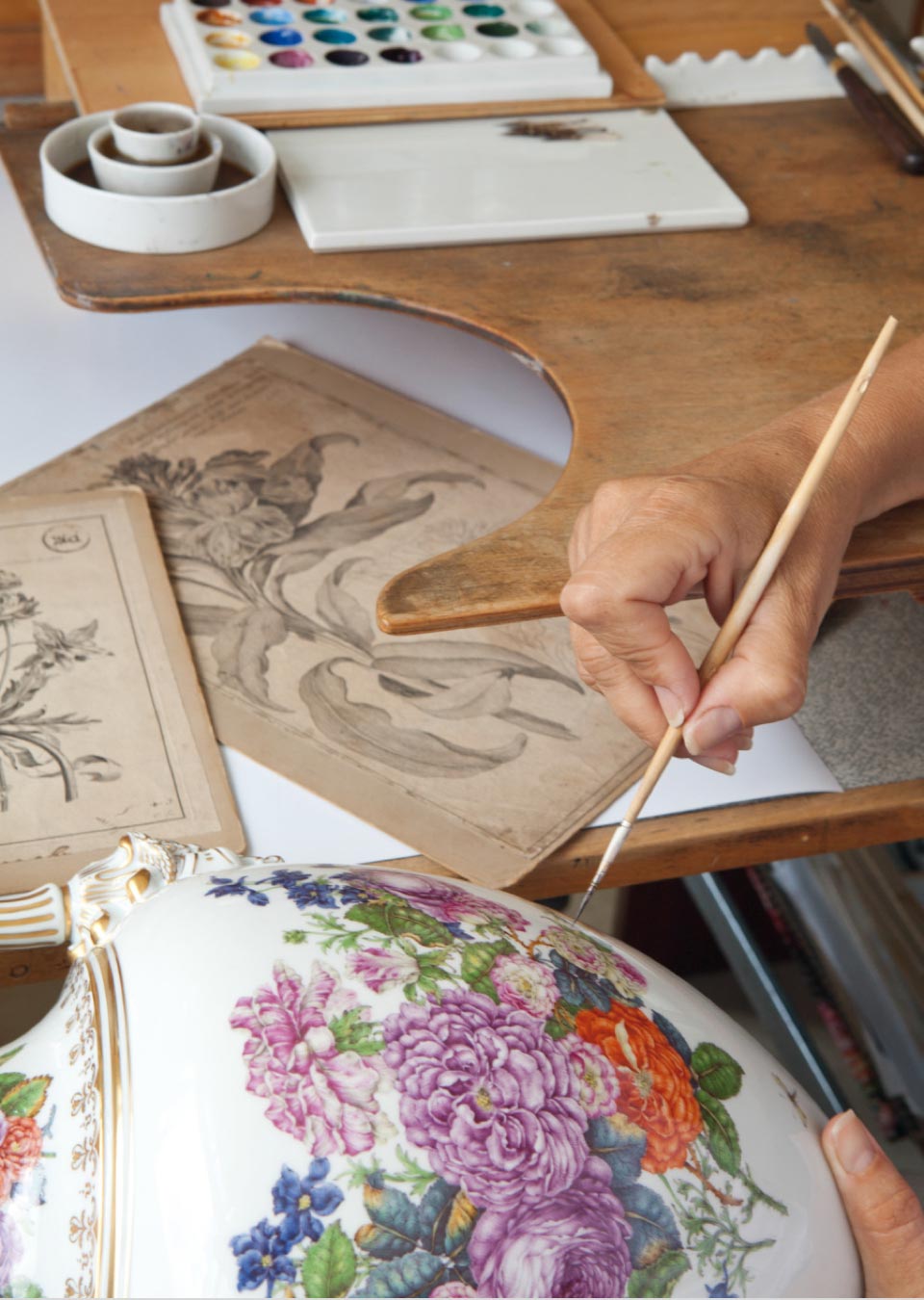 EmbossingDesigned and cast in a great number of individual pieces, Meissen figures and sculptures are assembled by the embossers. They use slurry, a liquid porcelain paste, a great deal of skill, and the right mix of pressure and intuition to assemble the individual pieces. Smaller decorative elements such as leaves, flowers, and scallops are formed by hand using a wooden mould and then attached to the figurine. In the final stage of this step, using a modelling stick and other tools, they flesh out details such as individual ringlets or a figure’s facial expression, and also retouch all of the seams. Embossers bring out a piece’s finer aspects and make the final touches in accordance with the modeller’s vision. This requires a great deal of artistic talent, which Meissen embossers learn during their three and a half years of professional training.