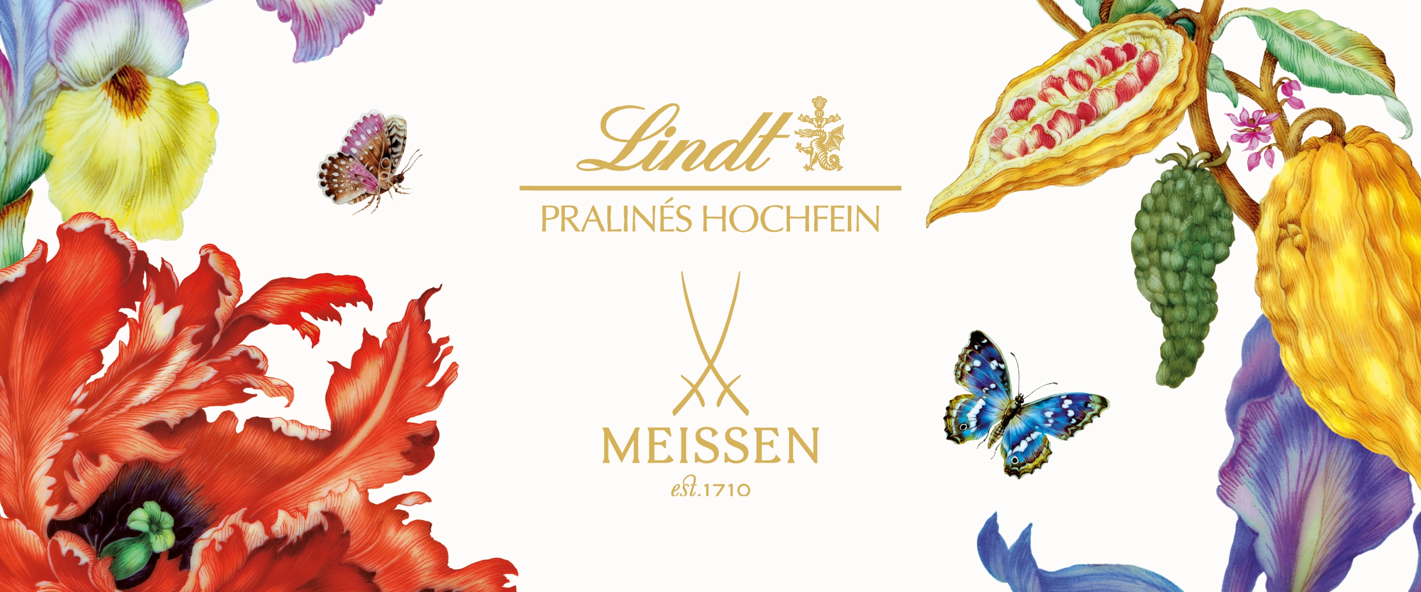 • What do MEISSEN porcelain and the Swiss chocolatier Lindt have in common? It's the love for the sweetest of all temptations - for chocolate! United by their passion for highest craftsmanship, perfect design and sensual pleasure, Lindt and MEISSEN had come together for an extraordinary cooperation: For a limited special edition of Lindt HOCHFEIN Pralinés, the porcelain manufactory MEISSEN created the design of the gift packaging. Golden cocoa beans compete in touching beauty with lush feather poppy blossoms, iris flowers and sun-ripened figs, surrounded by delicate butterflies as a symbol of filigree perfection. The inspiration for the design by Lena Hensel came from drawings by the naturalist Maria Sibylla Merian (1647-1717), which she made during a trip to Surinam, a then unexplored coastal state north of Brazil.