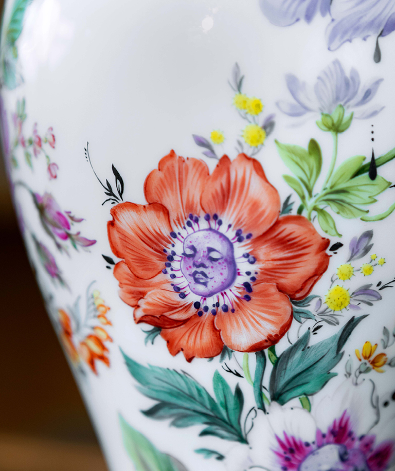 She was particularly shaped by the typical style of flower painting: precise, confidently placed brushstrokes that create light, shadow, and form with a single movement – without endless corrections. This technique not only changed the way she works on porcelain, but also had a lasting influence on her personal painting style.